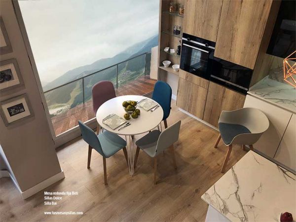 Beti es una mesa con una marcada personalidad por su diseño y te permite elegir el diámetro de encimera más adecuado a tus necesidades. Ésta puede ser de madera barnizada de roble o haya si te gusta conseguir un ambiente cálido. Puedes optar por encimeras de laca con un tacto sedoso y agradable. O de estratificado, material que destaca por su dureza, gama de colores y fácil limpieza, adecuado para uso diario e intensivo.